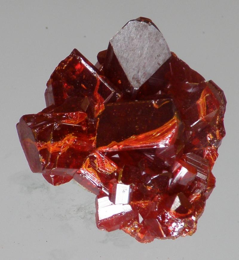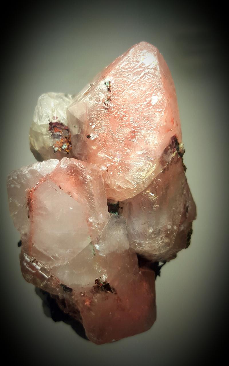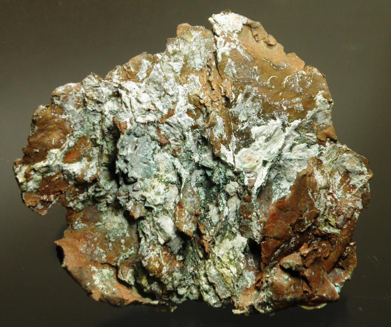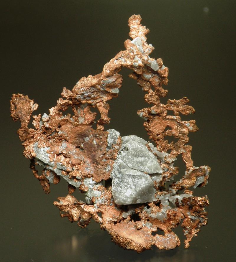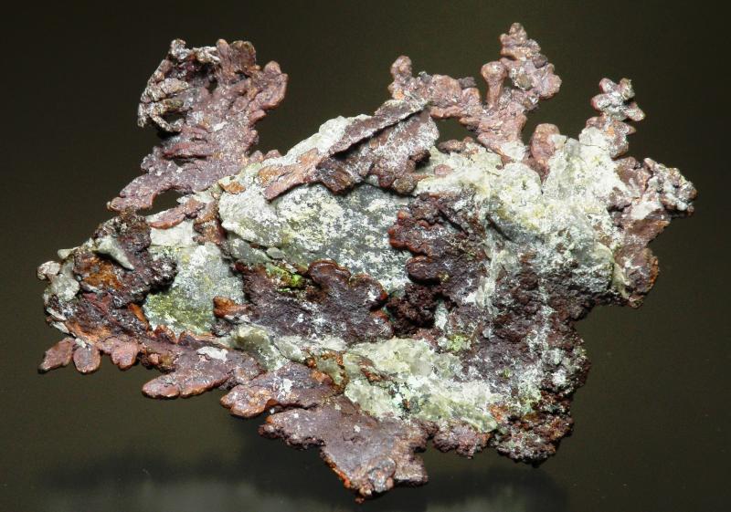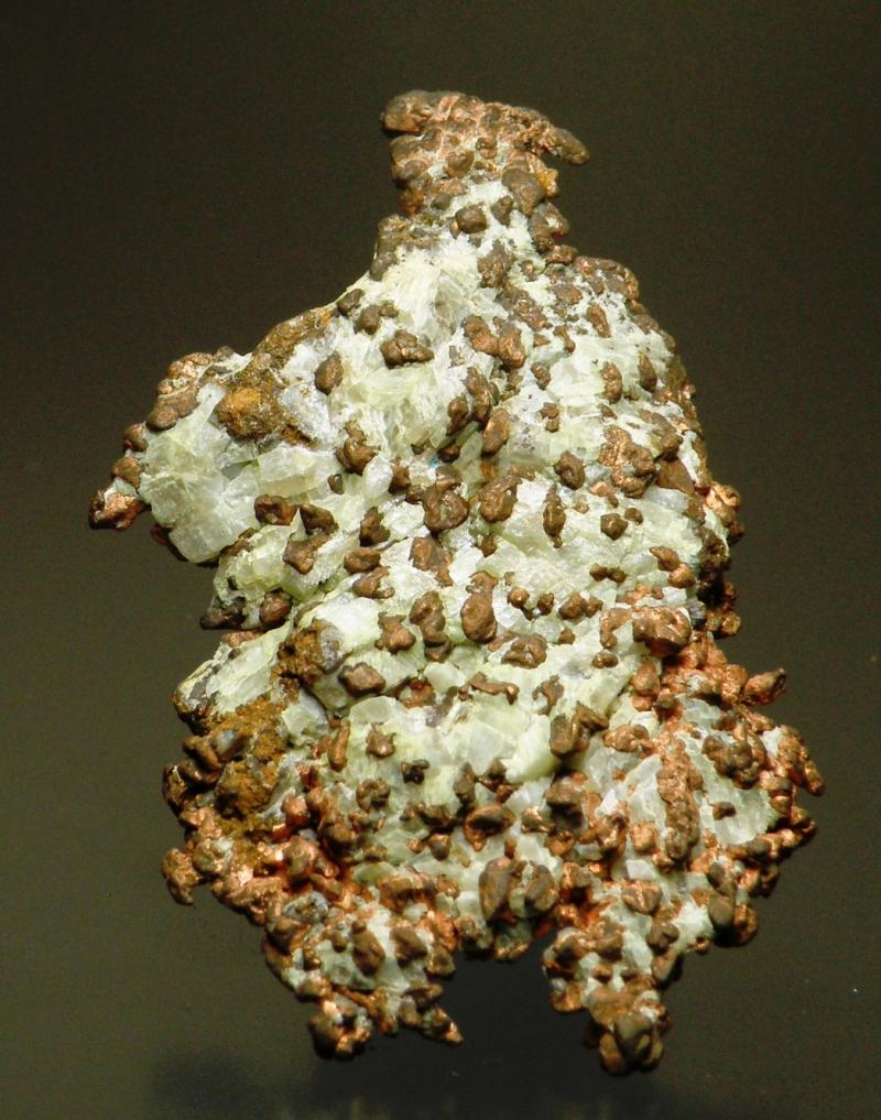 Bright untarnished Copper growths inside Calcite crystals up to 4 cm, with some hackly Native Copper with old time patina scattered here and there. A true classic from the Michigan Copper Belt!