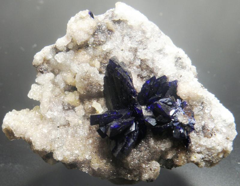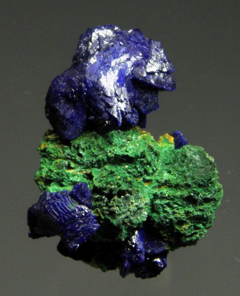 Excellent small plate of Azurite crystals, highlighted with several floral growths and some ridge-type formations.