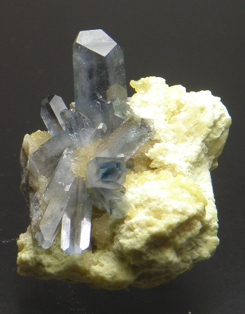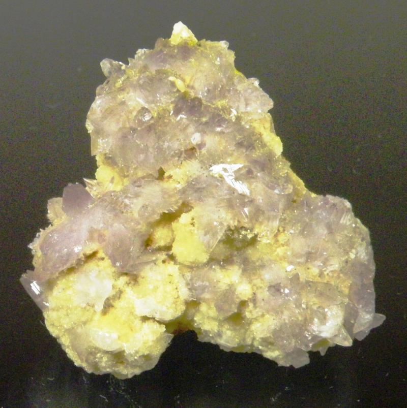 Shimmering lilac colored Creedite crystals on yellow Smithsonite matrix, from the famed Santa Eulalia mines in Mexico. Purple colored Creedites are much more rare than their orange counterparts from Durango...and here is a cute small mini that is a good representation without breaking the bank!